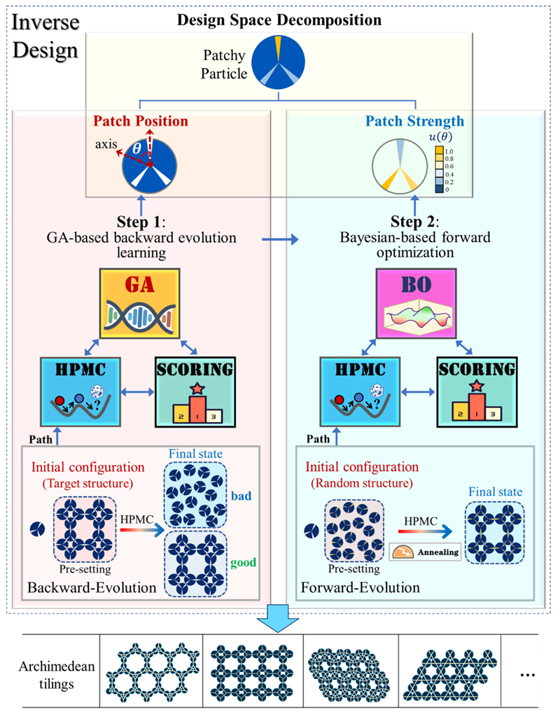 图1 两步法模块化逆向设计策略示意图。首先通过基于遗传算法的“反向演化”确定最优补丁位置,再利用基于贝叶斯优化的“正向演化”精调补丁结合强度,最终实现目标结构的自组装。