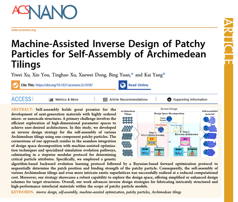 近日,松山湖材料实验室纳米生物材料团队元冰研究员与苏州大学杨恺教授合作,在这一领域取得重要进展。研究团队发展了一种基于机器学习的模块化逆向设计策略,巧妙地将高维设计问题有效降维。在每一种目标结构的设计中,该方法仅使用了单一组分的补丁粒子,成功实现了多种阿基米德镶嵌(Archimedean tilings)等复杂超晶格结构的高效、精准设计。该策略不仅显著降低了计算成本,还获得了比以往预期更为精简的设计方案,为功能材料的按需定制开辟了新路径。相关研究结果以Machine-Assisted Inverse Design of Patchy Particles for Self-Assembly of Archimedean Tilings为标题发表于ACS Nano。