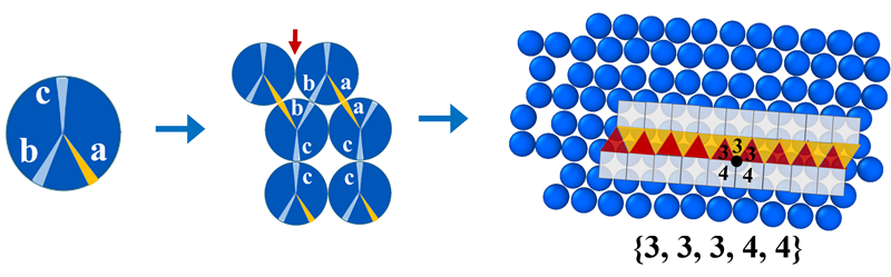 图3 {3, 3, 3, 4, 4}阿基米德镶嵌的极简设计。左侧为设计的3补丁粒子,右侧为通过该单一组分粒子自组装形成的目标结构。