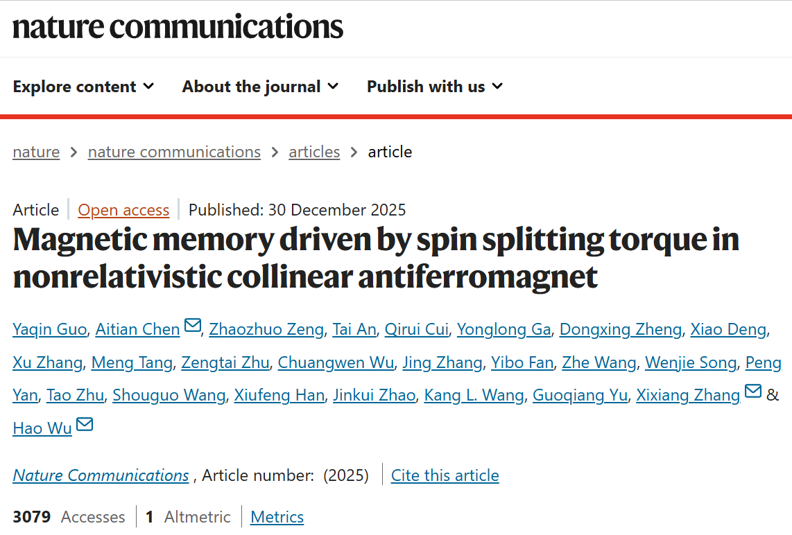 相关研究成果以“Magnetic memory driven by spin splitting torque in nonrelativistic collinear antiferromagnet”为题发表在Nature Communications期刊,松山湖材料实验室为论文第一单位,郭雅琴博士、陈爱天博士和曾钊卓博士为论文第一和共同第一作者,吴昊研究员为论文通讯作者。
