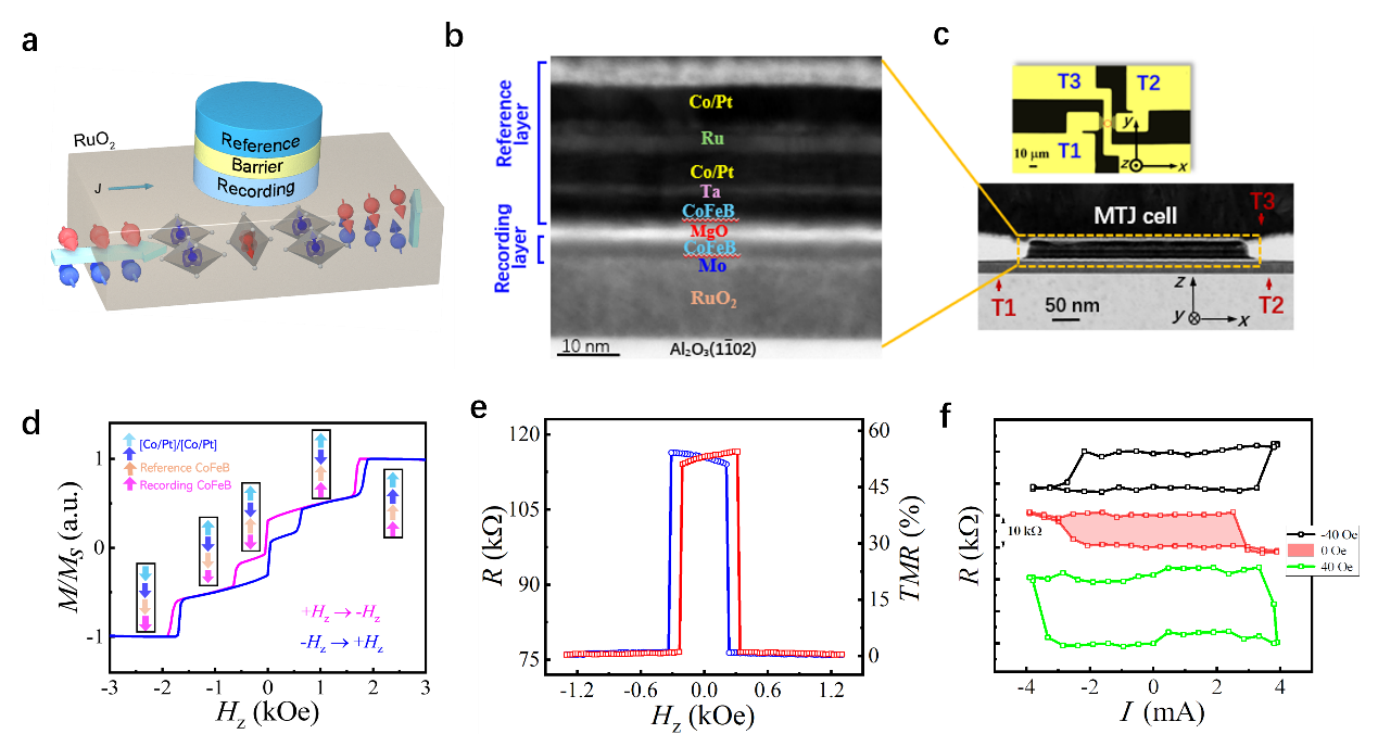 图2. 基于交错磁体RuO2的三端SST-MRAM器件结构示意图和读写测试