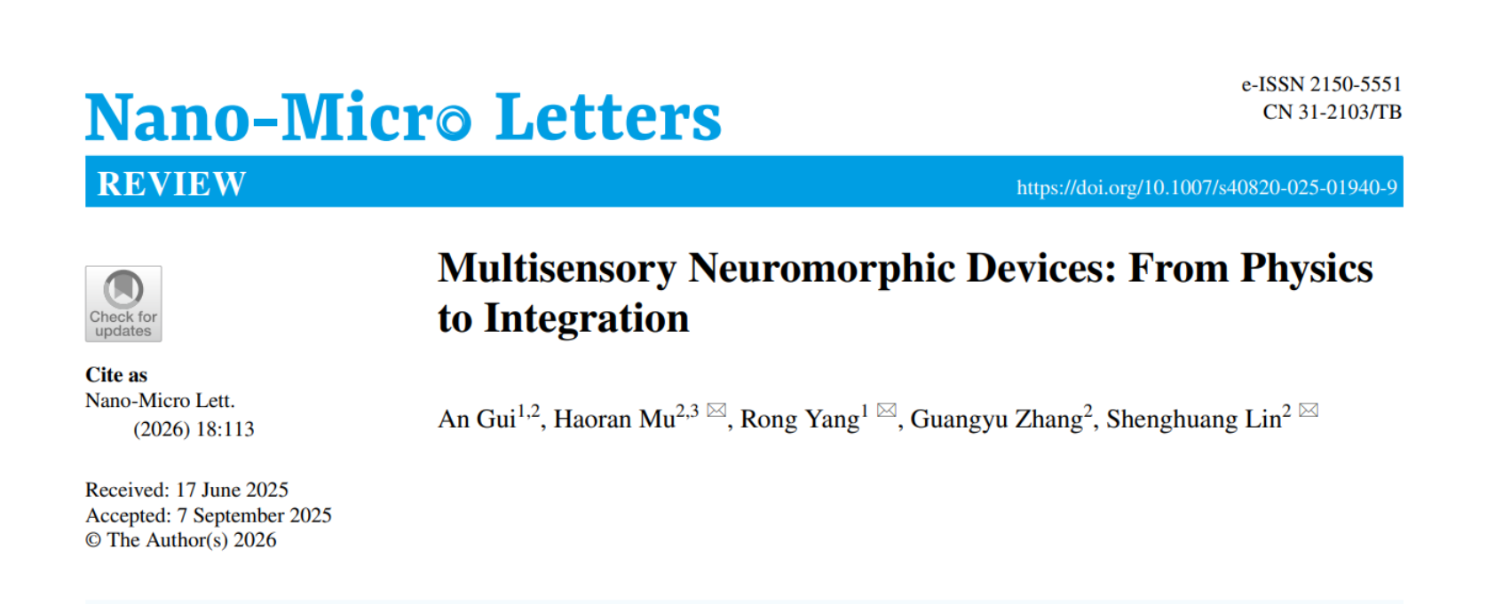 近日,松山湖材料实验室新型光电功能材料与器件团队林生晃研究员与湖南大学杨蓉教授合作,以“Multisensory Neuromorphic Devices: From Physics to Integration”为题发表相关综述性论文(Nano-Micro Lett. (2026) 18: 113),深入梳理了多模态神经形态器件背后的复杂物理机制。这些机制在感知各种输入信号时的工作原理得到了系统性的阐明。还对它们在多模态感知中的实现策略进行了全面分析,并将多感官神经形态器件分为三个架构类别。针对每个类别,探讨了各种多感官融合方法和信号处理技术,旨在有效地处理多感官刺激并构建高效的神经形态感知系统。文章最后对多模态感知系统当前面临的挑战进行了全面总结,并对未来的发展方向提出了前瞻性的展望。
