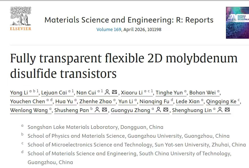 近日,松山湖材料实验室新型光电功能材料与器件团队联合广州大学、中山大学等单位在二维材料柔性电子器件领域取得重要进展,相关研究成果以“Fully transparent flexible 2D molybdenum disulfide transistors”为题发表研究性论文(Materials Science & Engineering R 169 (2026) 101198),开发了基于聚(3,4-乙烯二氧噻吩):聚(4-苯乙烯磺酸盐)(PEDOT:PSS)范德华电极的全透明柔性二硫化钼(MoS2)场效应晶体管(FET)。该器件兼具高电子迁移率、高可见光透过率与优异的机械柔性,有效克服了传统柔性二维晶体管性能衰减、透光性不足及机械可靠性差等关键瓶颈,为下一代透明柔性电子器件的发展提供了新思路。