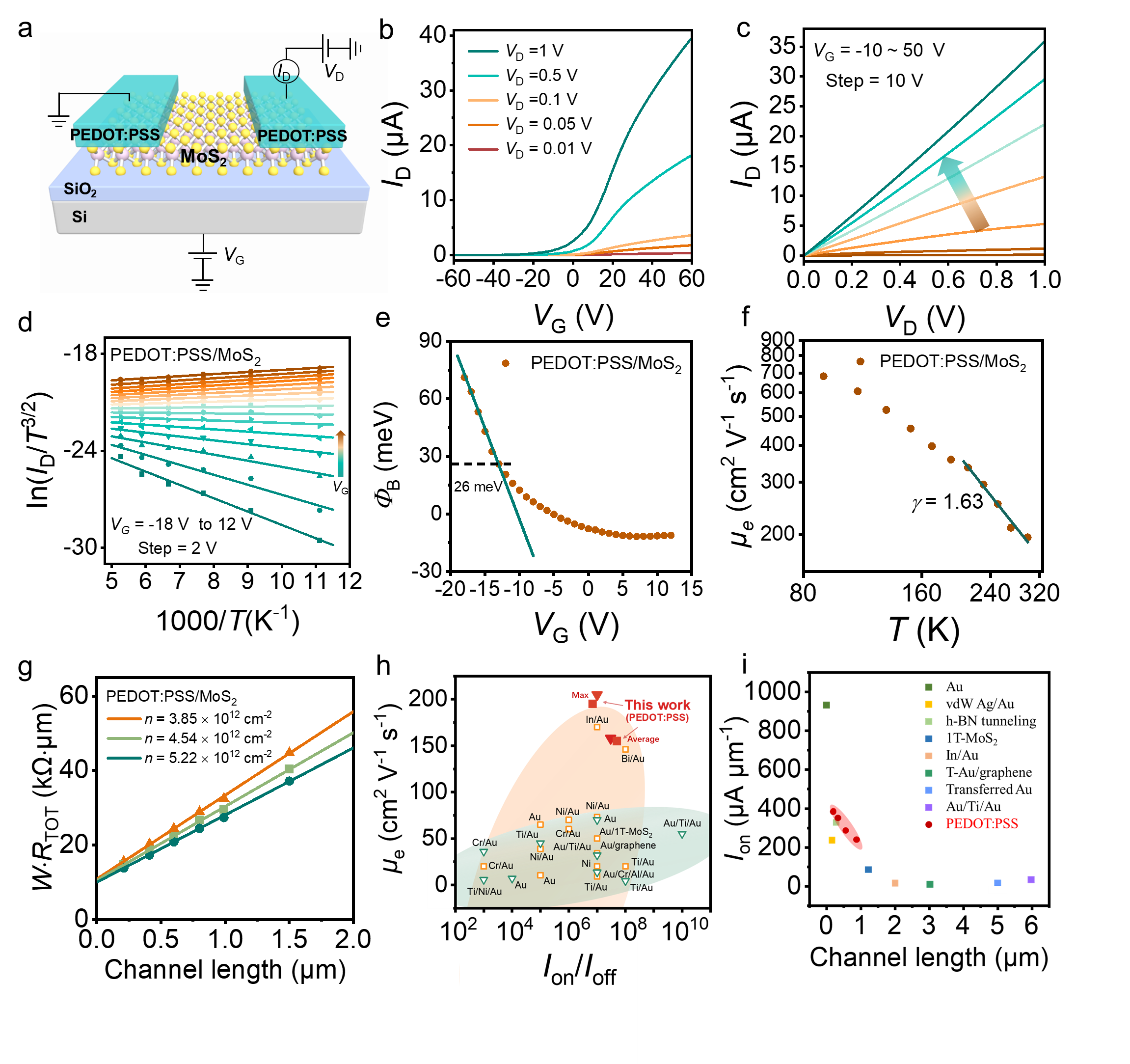 图2. 基于PEDOT:PSS电极的MoS2晶体管电学特性表征