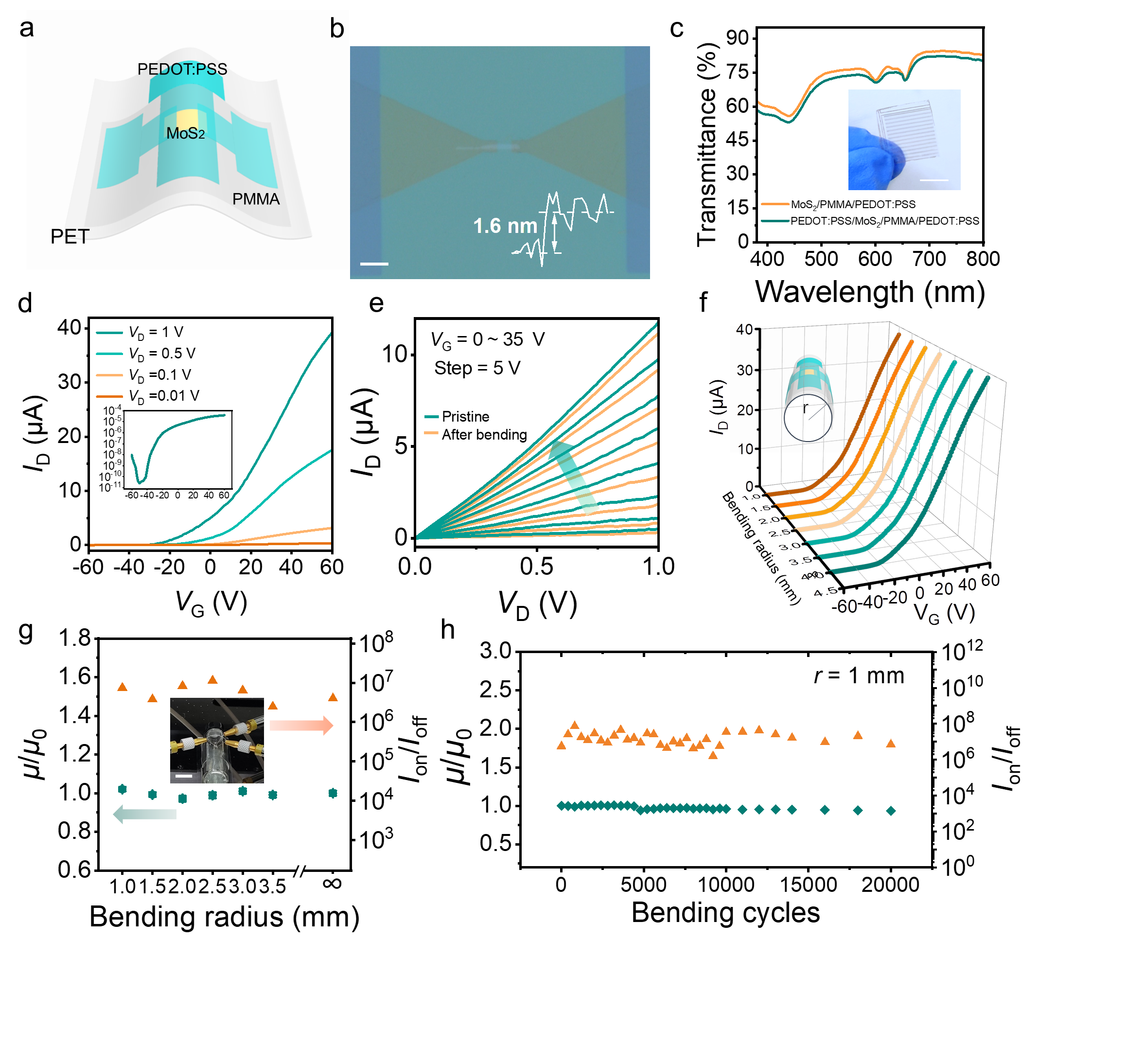 图5. 基于PEDOT:PSS范德华电极的全透明柔性二维晶体管