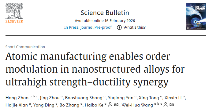 近期,松山湖材料实验室非晶材料团队创新性地提出了一种原子制造策略,首次在固定成分的ZrCuAl合金中实现了跨越多尺度与有序度程度的纳米结构精准定制(图1),成功突破强塑性协同极限。相关成果2026年2月16日以“Atomic manufacturing enables order modulation in nanostructured alloys for ultrahigh strength–ductility synergy”为题发表于国际学术期刊《Science Bulletin》上。