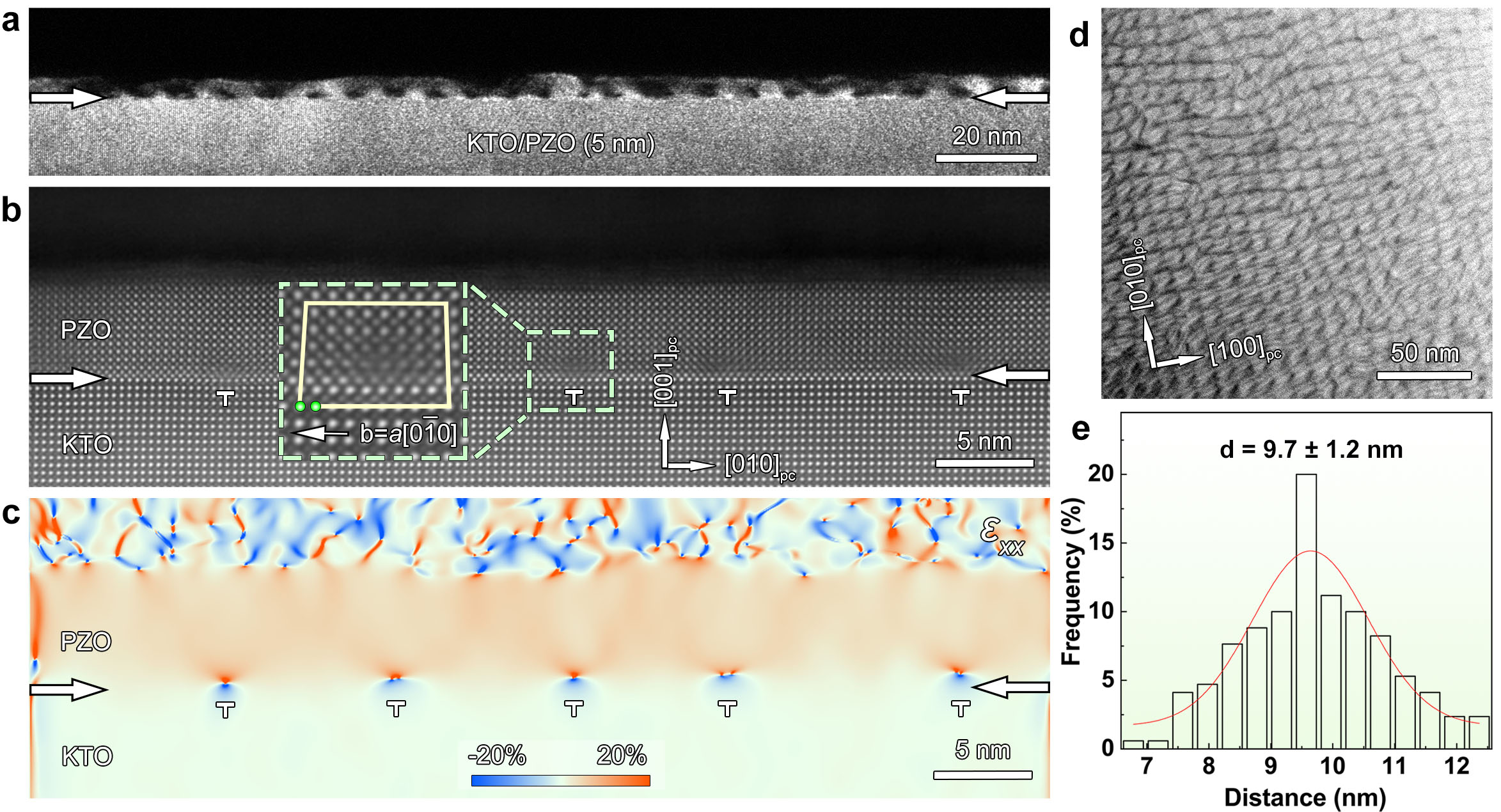 近日,松山湖材料实验室、中国科学院东莞材料所和中国科学院金属研究所多个研究机构组成的研究团队,在经典反铁电材料——锆酸铅(PbZrO3)薄膜研究中取得重要进展。研究团队发现,电极化拓扑结构与晶体中的一维结构拓扑缺陷(位错)之间存在强相互作用。借助超高分辨电子显微学成像、谱学研究以及相场模拟,他们观察到,作为经典一维拓扑线缺陷的“位错”,其周围产生的应变场能够在超薄PbZrO3薄膜中自发诱导出一种有序排列的极性“反刺猬畴”四方晶格。这是一种此前未曾报道过的全新电极化拓扑结构。3月13日,相关研究成果以“Strong interplay between polar and structural topologies”为题在线发表于《自然通讯》(Nature Communications)。