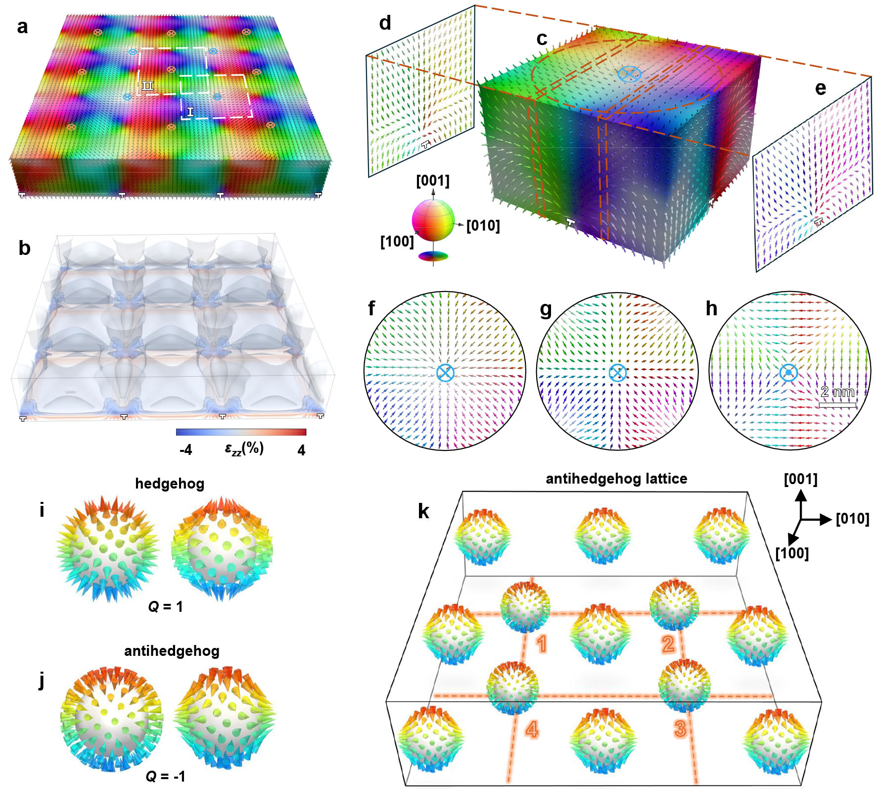 面对这一瓶颈,研究团队另辟蹊径,从“缺陷工程”入手,探索晶体中经典的一维拓扑缺陷——“位错”对极化的潜在操控能力。通过原子尺度的透射电子显微分析,他们发现PbZrO3薄膜界面处的位错核心能够有效钉扎并汇聚电极化矢量。位错阵列引入的周期性非均匀应变场,充当了调控电偶极矩排布的“模具”,迫使原本反平行的极化发生连续旋转和重构。最终,一种高度有序且前所未有的极化“反刺猬畴”四方晶格在应变场的诱导下自发形成。这一发现首次在反铁电材料中实现了极化拓扑结构的可控构筑,为拓扑缺陷工程调控材料功能提供了全新范式。
