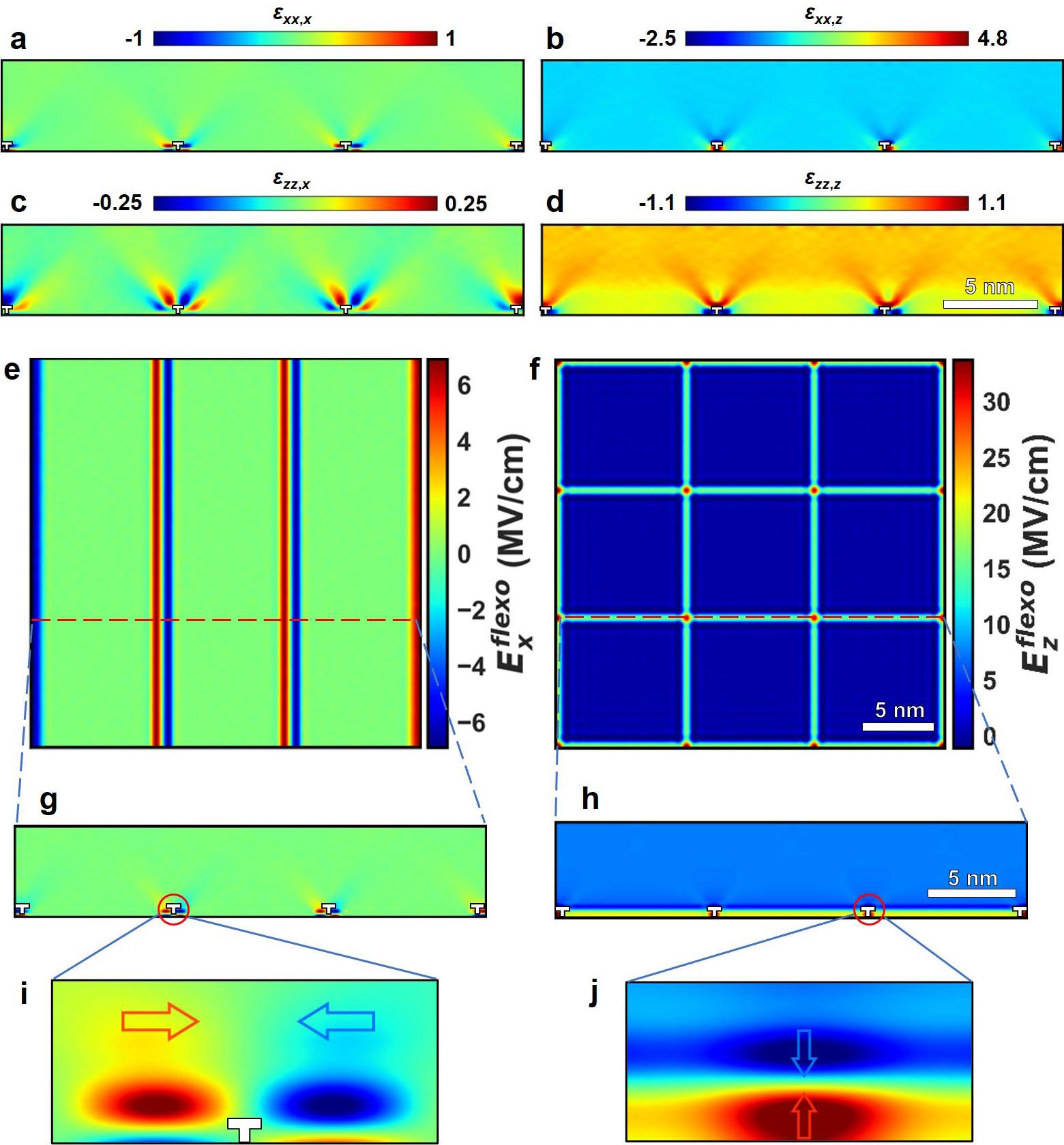 为揭示这一奇特现象的物理本质,研究团队结合相场模拟开展了深入机制分析。结果表明,电致伸缩效应与挠曲电效应的协同耦合是驱动极化拓扑重构的关键。具体而言,位错周围巨大的应变与应变梯度通过两种效应产生了强局域有效电场:电致伸缩效应实现了应变与电极化的直接耦合,挠曲电效应则将应变梯度转化为等效电场,二者共同作用,打破了反铁电材料固有的反平行极化束缚,驱动电偶极矩发生连续旋转和重排,最终稳定形成周期性的"反刺猬畴"四方晶格。