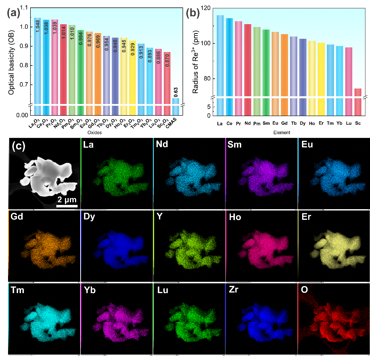 图3 (a)稀土氧化物的光学碱度,(b)稀土离子的半径与(c) (12RE1/12)2Zr2O7高熵陶瓷粉体及元素面分布图