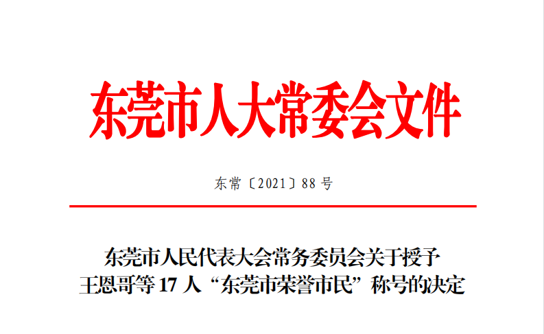 据悉,为鼓励和表彰对东莞有突出贡献的外来人士,借鉴国内先进城市有关做法,1996年9月,东莞市人民政府出台了《东莞市授予荣誉市民称号的办法》,开启首批东莞市荣誉市民的评选和表彰工作,最终授予98位港澳同胞、海外侨胞和外国友好人士东莞市荣誉市民称号。随后,在2001年、2008年、2011年和2015年,又分别有84人、49人、36人、46人获得这项殊荣。