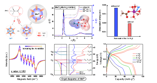 图2. 醋酸根-Mn2+离子特异性配位促进脱溶剂动力学及新型水系锰离子电池设计