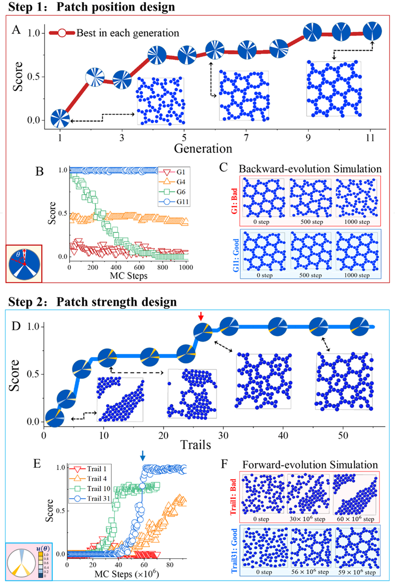 第二步:基于贝叶斯优化(BO)的“正向演化”,精准调节结合强度。 在确定补丁位置后,参数空间维度已大幅降低。团队继而采用贝叶斯优化算法,对补丁间的结合强度这一连续参数进行精细调节。贝叶斯优化利用先验知识指导采样,能够以最少的模拟次数(即计算成本较高的“正向”自组装模拟)找到最优解,确保了设计方案在真实自组装过程中的可行性。
