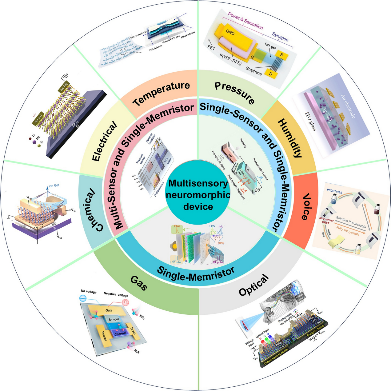 在物联网技术蓬勃发展的驱动下,智能传感环境正变得日益复杂,这对具备实时、低功耗多感官感知能力的神经形态系统提出了迫切需求。传统感官架构因受限于单模态处理模式和集中式计算范式,难以适应多样化、动态化的输入条件要求。而多感觉神经形态装置通过模拟生物系统的分布式、事件驱动处理机制,展现出极具潜力的解决方案。不过,多感觉神经形态装置在信号转换效率、编码兼容性以及融合异构输入时不丢失感官信息等方面仍面临挑战。这些局限性进一步凸显出深入探究多模态神经形态系统所涉及的物理机制与融合原理的必要性。