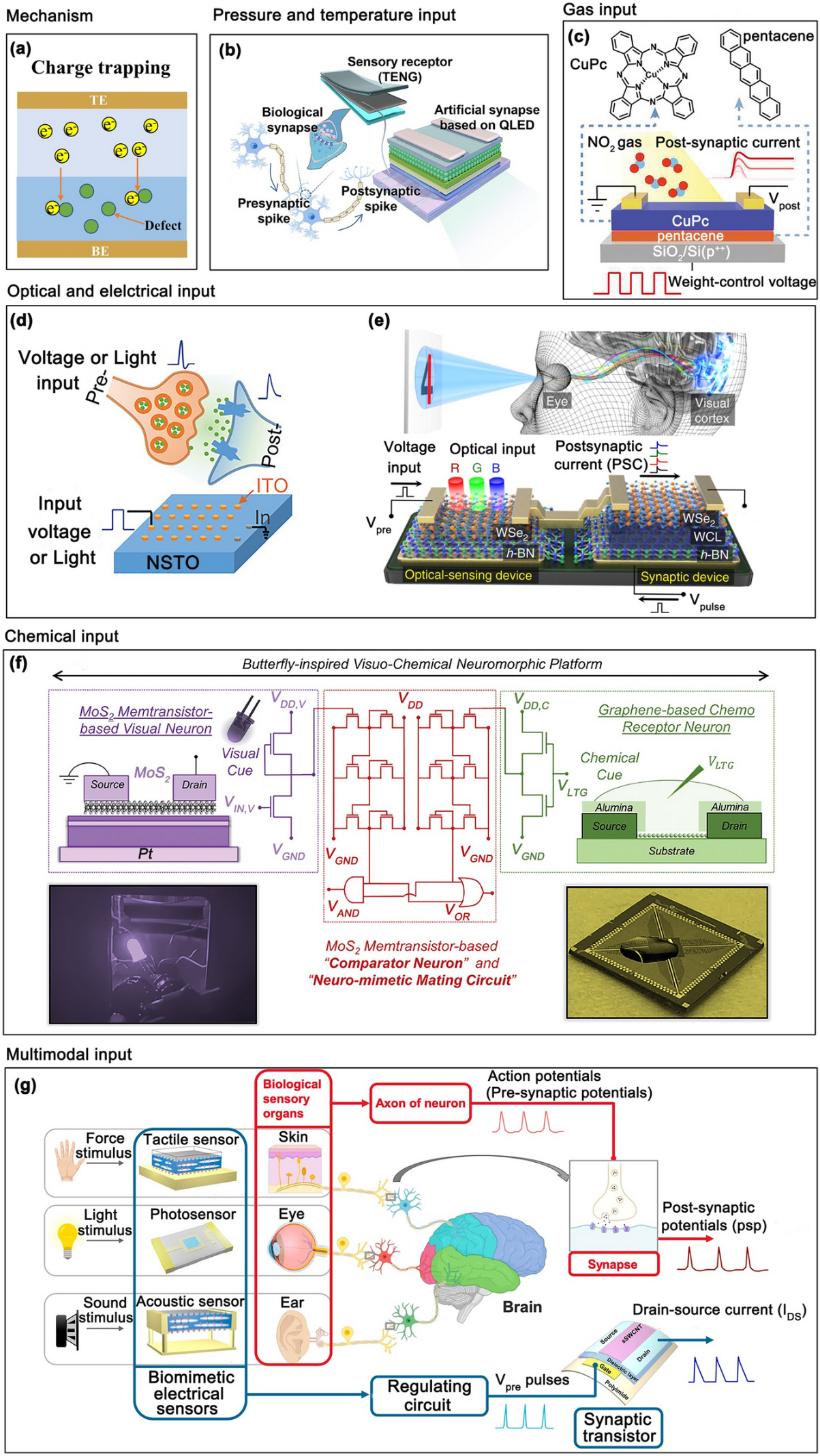 图3 电荷捕获型突触器件处理多模态刺激。(a) 通过缺陷捕获实现的电阻切换机制。(b) 包含压力/温度输入的人工多模态系统示意图。(c) 用于检测 NO2 的有机异质结构感觉突触。(d) 光电突触实验装置。(e) 采用h-BN/WSe2材料的启发式生物光电子神经系统。(f) 采用忆阻器电路的蝴蝶启发式视觉化学神经元平台。(g) 处理光学/压力/声音刺激并进行神经信息传输的生物感觉器官。