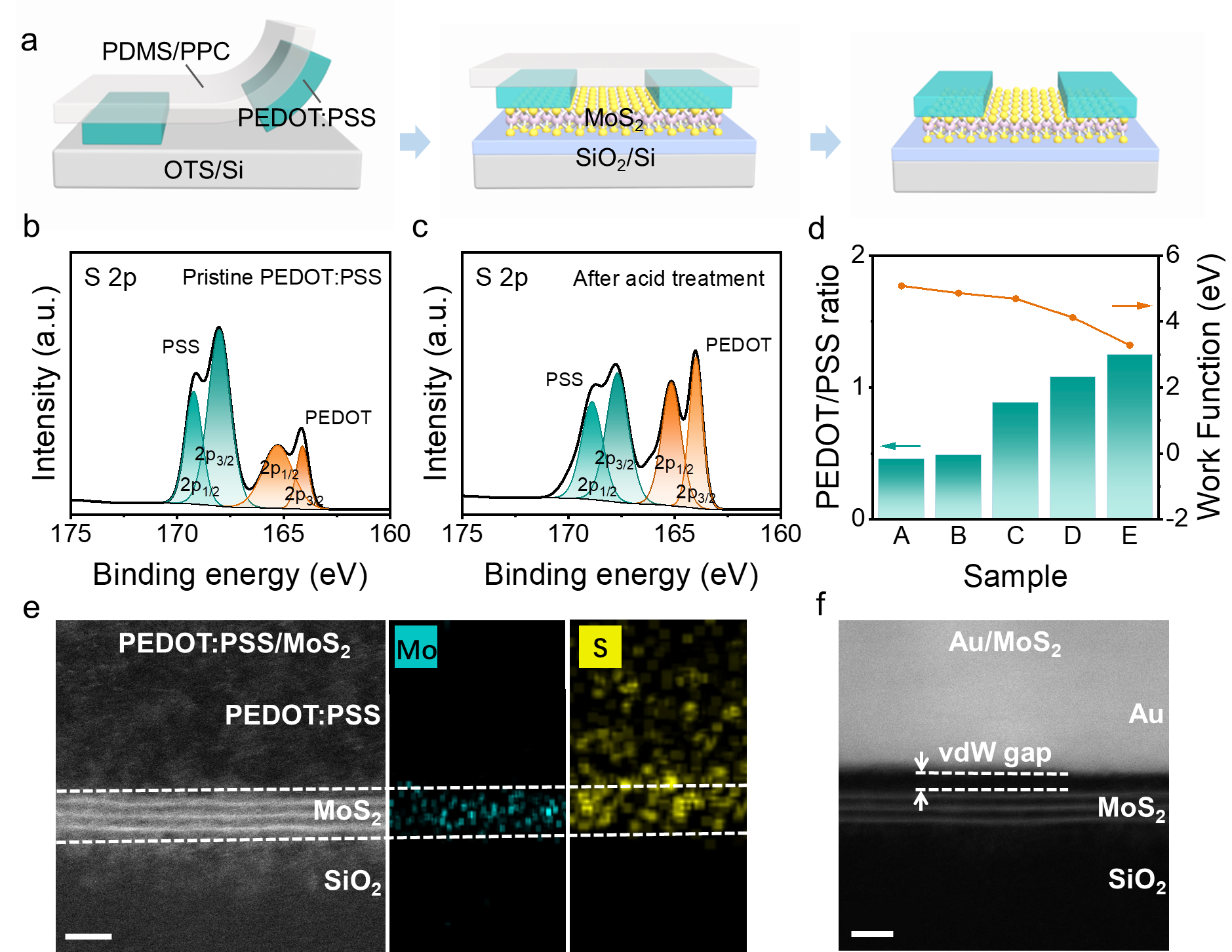 研究团队采用光刻工艺制备PEDOT:PSS聚合物电极,并通过范德华转移法与二维MoS2半导体构建异质集成,实现了高性能晶体管器件的制备。PEDOT:PSS作为一种导电聚合物,天然具备高可见光透过率、优异机械柔性与低温溶液可加工性。研究团队进一步通过酸处理工艺对其进行精准调控,实现了功函数在3.28 eV至5.08 eV范围内的连续可调,显著优化了其与MoS2的能级匹配与界面接触特性。