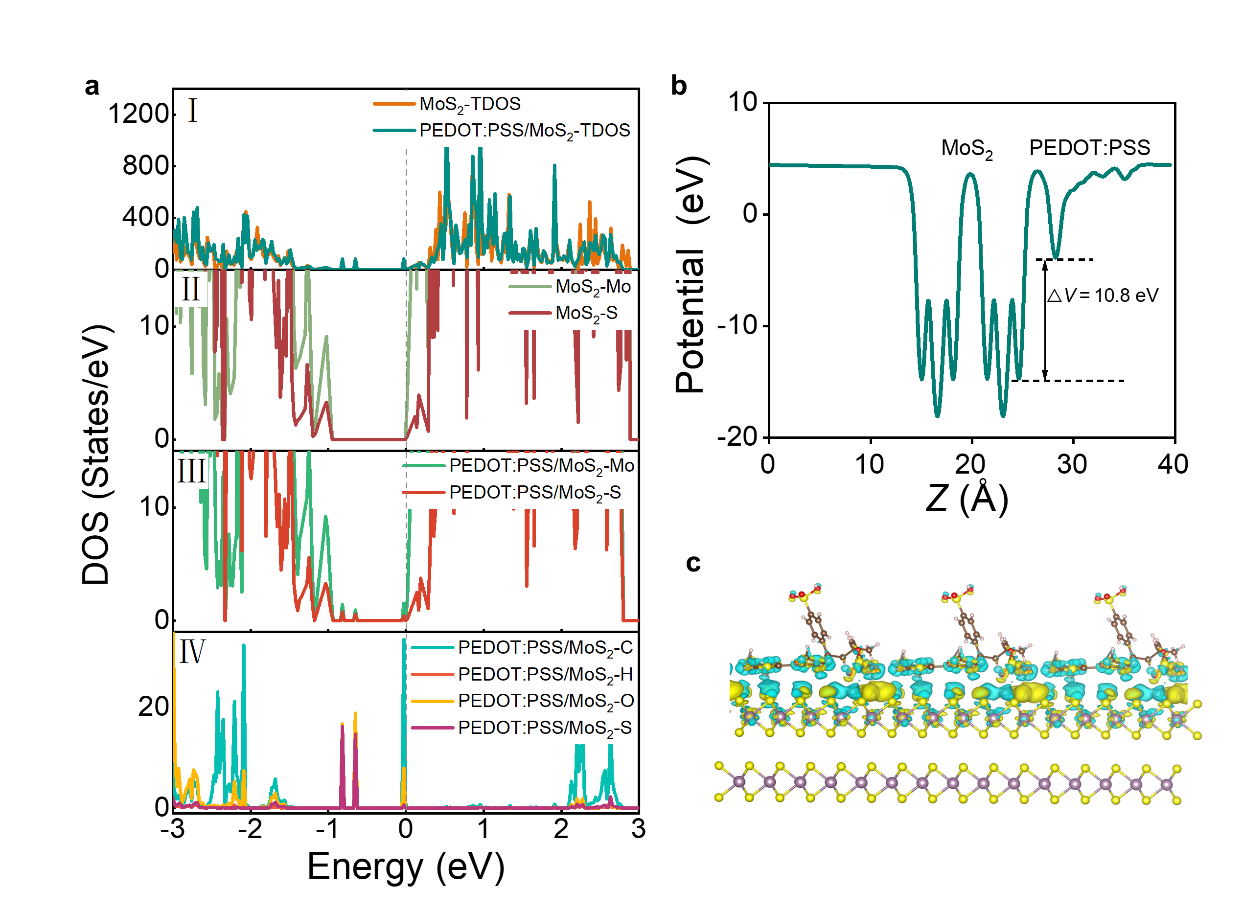 图4. PEDOT:PSS/MoS2接触的DFT计算