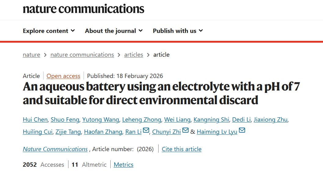 近日,松山湖材料实验室水系锌基电池团队、香港大学支春义教授与香港城市大学吕海明教授,联合延安大学李然副教授等科研人员取得重要进展,在国际权威学术期刊《Nature Communications》上发表了题为《An aqueous battery using an electrolyte with a pH of 7 and suitable for direct environmental discard》的突破性研究成果。研究团队创新性地开发出了一种 pH=7 的中性水系 Mg2+/Ca2+ 金属离子电池。令人惊叹的是,这款电池的电解质极其安全,竟然采用了日常生活中可以用来“点豆腐”的“卤水”。这意味着,该电池在用完报废后,即便直接丢弃也完全不会对自然环境造成任何污染!据悉,该项工作的第一作者为松山湖材料实验室与延安大学联合培养的硕士研究生陈辉。此外,上述研究工作得到了松山湖材料实验室创新样板工厂团队项目、国家自然科学基金等项目的大力支持。