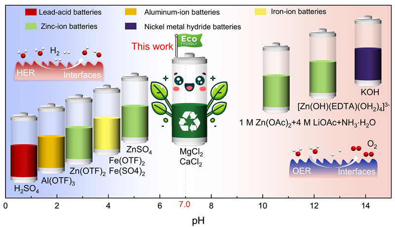 水系电池历经两百余年的发展历史,凭借其本征的安全性和低成本优势广受业界青睐。然而,传统水系体系(如铅酸电池)高度依赖强酸或强碱性电解液,这不仅加剧了电极的界面腐蚀、将循环寿命局限在区区数百次,更引发了严重的析氢、析氧等寄生副反应,导致其废弃后成为沉重的生态环境负担。为了解决这一痛点,科研人员将目光投向了天然具有“高能量搬运”潜力的二价金属离子(Mg2+和Ca2+),并创造性地采用pH=7.0的完全中性电解液。令人称奇的是,这种极致环保的电解液,其成分与我们日常菜市场里用来“点豆腐”的卤水如出一辙,从根本上剥离了强酸碱带来的危险与污染。