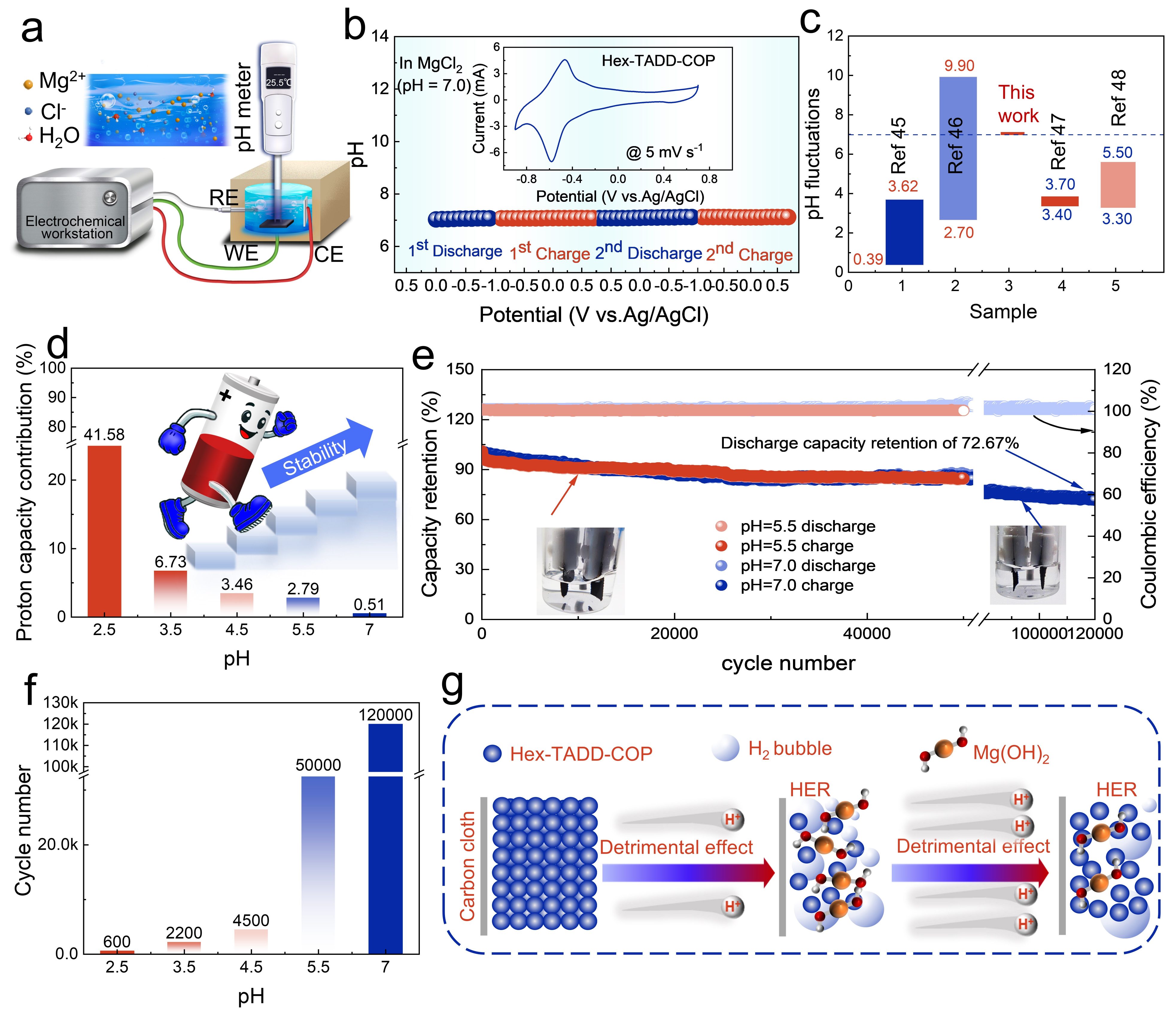 图3 Hex-TADD-COP负极中质子参与的研究。a三电极原位pH测量装置示意图,其中Hex-TADD-COP在充放电过程中作为工作电极。b Hex-TADD-COP在饱和MgCl₂电解质(pH = 7.0)中的循环伏安(CV)曲线以及前两次循环中电极表面的相应pH变化。c pH 7.0下的pH波动范围与先前研究报道值的比较。d 不同pH值的MgCl₂电解质中质子对容量的贡献。e Hex-TADD-COP在饱和MgCl₂电解质(pH 5.5和7.0)中,于10A g⁻¹比电流下的容量保持率,以及循环后烧杯电池的光学图像。f Hex-TADD-COP在不同pH值的饱和MgCl₂电解质中的循环稳定性。g 质子参与对Hex-TADD-COP结构完整性的有害影响示意图。