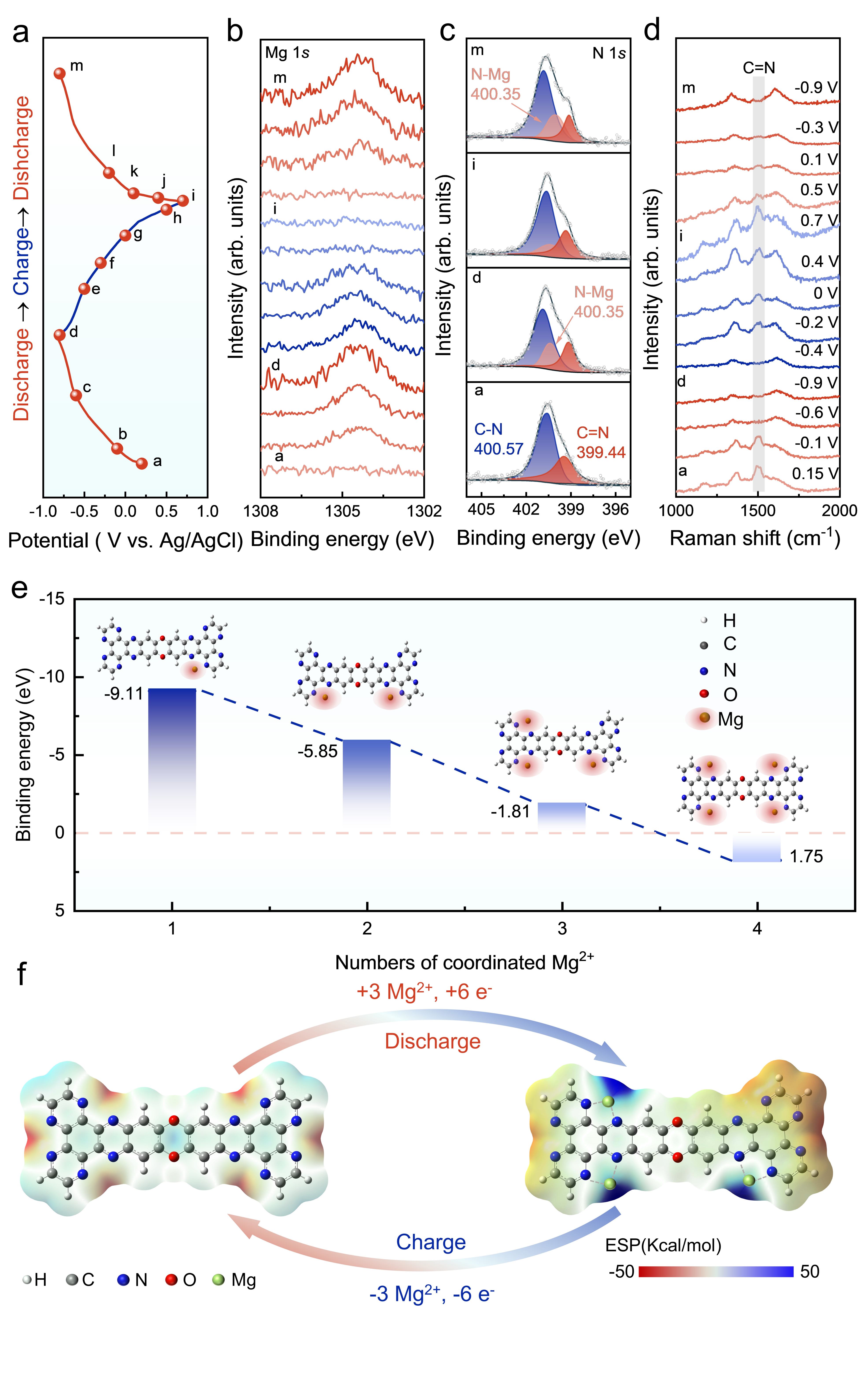 图5 Hex-TADD-COP负极在中性饱和MgCl₂电解质中的电荷存储机制。a Hex-TADD-COP负极在5A g⁻¹比电流下的恒流充放电(GCD)曲线,在标记点进行了各种非原位测量。b Mg 1s区域的非原位X射线光电子能谱(XPS)谱图。c N 1s区域的非原位XPS谱图。d 充放电过程中记录的原位拉曼光谱。e Mg²⁺与Hex-TADD-COP最稳定重复单元在不同电荷存储阶段的结合能。f 充放电机制示意图。