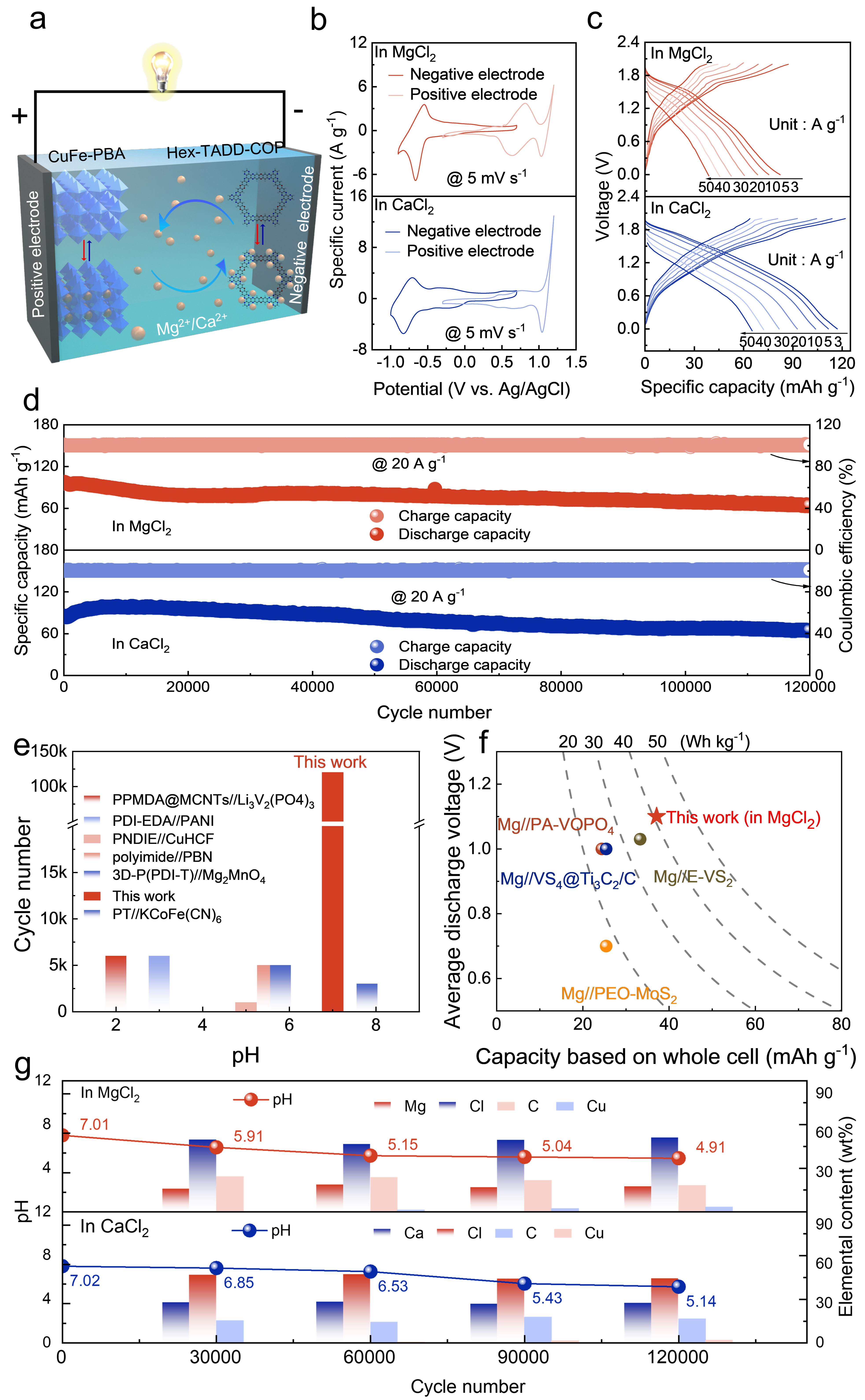 图6 以Hex-TADD-COP为负极、CuFe-PBA为正极的高度生态友好型水系二价金属离子全电池的性能(25°C±2°C)。a全电池反应机理示意图。b Hex-TADD-COP负极和CuFe-PBA正极的循环伏安(CV)曲线比较。c 不同比电流下的恒流充放电(GCD)曲线。d 在20A g⁻¹下的循环性能。e 与文献报道数据的循环性能比较(参考补充表S3)。f 与基于镁金属的全电池相比,考虑整个电池(负极、正极和电解质)的比能量。g 多次循环后全电池中电解质的pH值和元素组成(wt. %)。