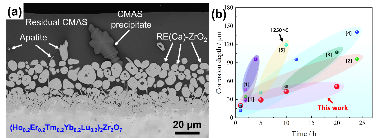深入研究表明,两款新型材料的优异抗腐蚀性能均与光学碱度密切相关。重稀土氧化物的光学碱度与CMAS差异更小,化学反应活性更低,且不易形成磷灰石相;同时高熵效应带来的晶格畸变与迟滞扩散效应,进一步抑制了CMAS熔体的渗透与离子扩散。