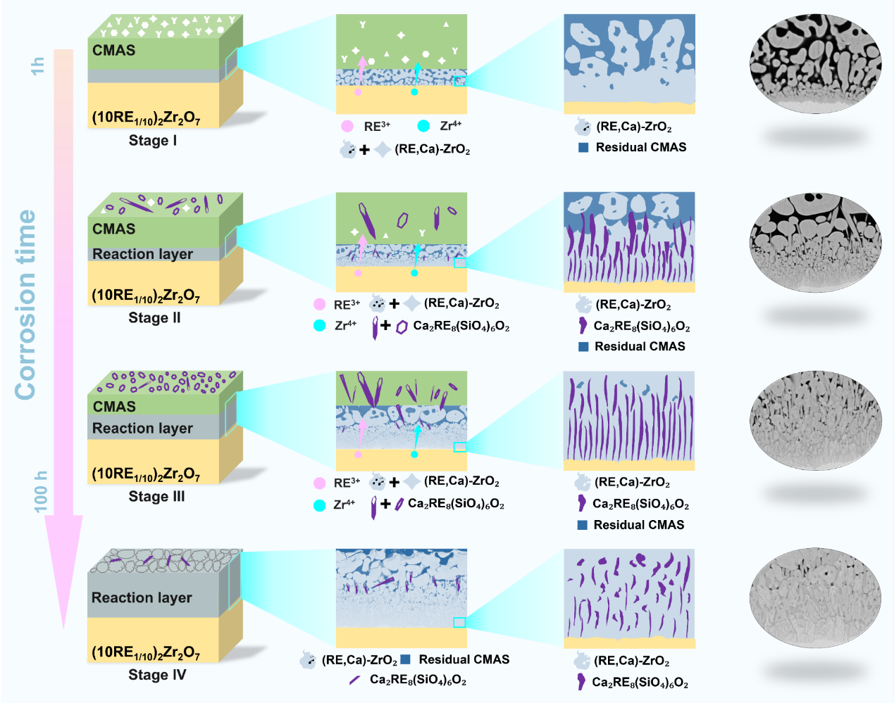 该材料精选Sm、Eu、Gd、Dy、Y、Ho、Er、Tm、Yb和Lu,共10种低光学碱度稀土元素,合成出单相缺陷萤石结构高熵陶瓷。性能测试显示其全方位优势:1000 ℃时热导率低至1.54 W·m-1·K-1;1200 ℃时热膨胀系数达10.92 ×10-6·K-1;1500 ℃热暴露200 h后仍保持单相结构,晶粒生长速率仅为8.5 nm/h。尤为突出的是,1300 ℃腐蚀 50 h 后反应层厚度仅40.3 μm,优于现有同类材料,成为当前抗CMAS腐蚀性能最优的HE-REZs热障涂层候选材料,其腐蚀机制如图4所示。