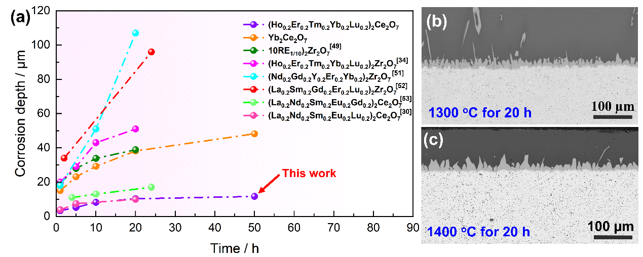 图5 (a) (Ho0.2Er0.2Tm0.2Yb0.2Lu0.2)2Ce2O7高熵陶瓷与典型HE-REZ、HE-REC在1300℃下的腐蚀深度随时间的变化曲线,以及(Ho0.2Er0.2Tm0.2Yb0.2Lu0.2)2Ce2O7在(b)1300 ℃和(c)1400 ℃熔融CMAS膜下腐蚀20 h后的截面SEM图